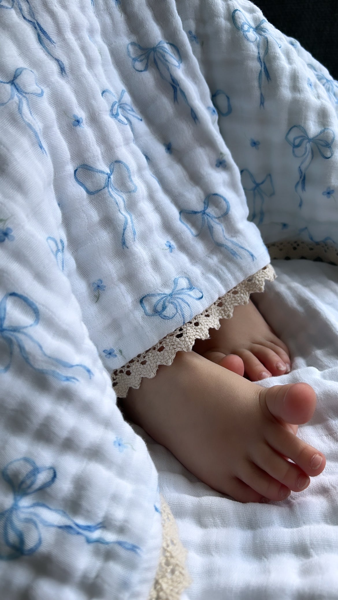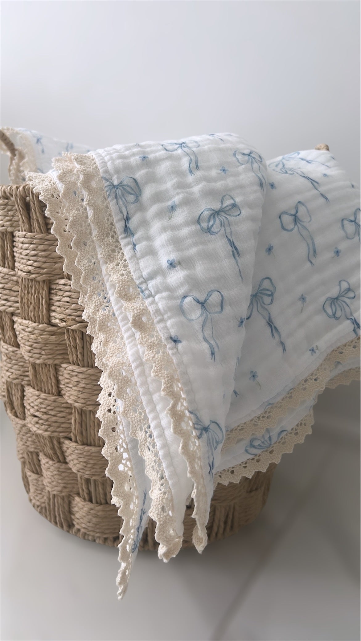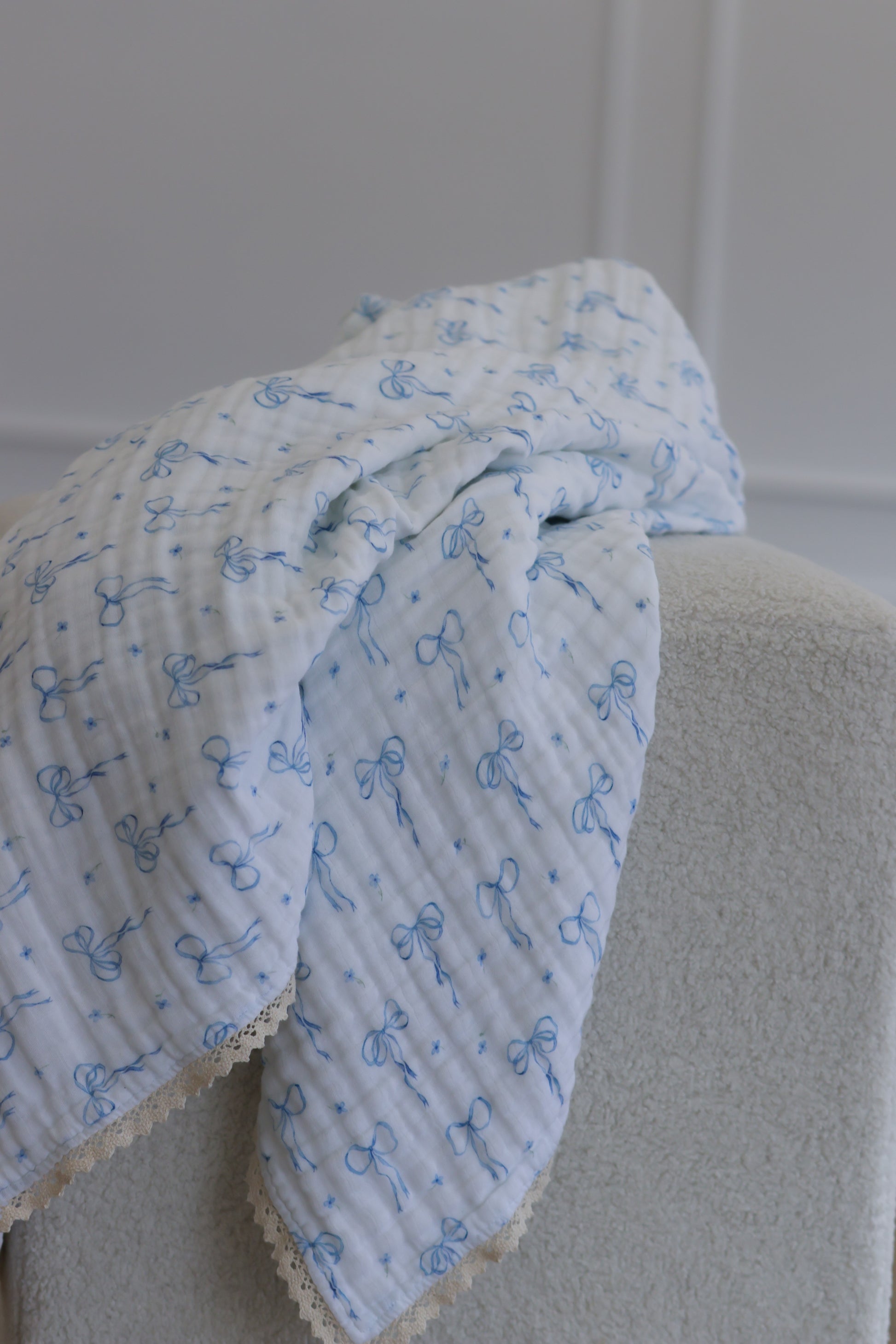 Designed for life’s first, sweetest moments, our Something Blue Baby Blanket wraps your little one in cloud-like softness and delicate, vintage charm. Crafted from six airy layers of breathable cotton and finished with a beautiful French lace trim, it’s made to hold your most treasured memories — from the first snuggle to the first steps.