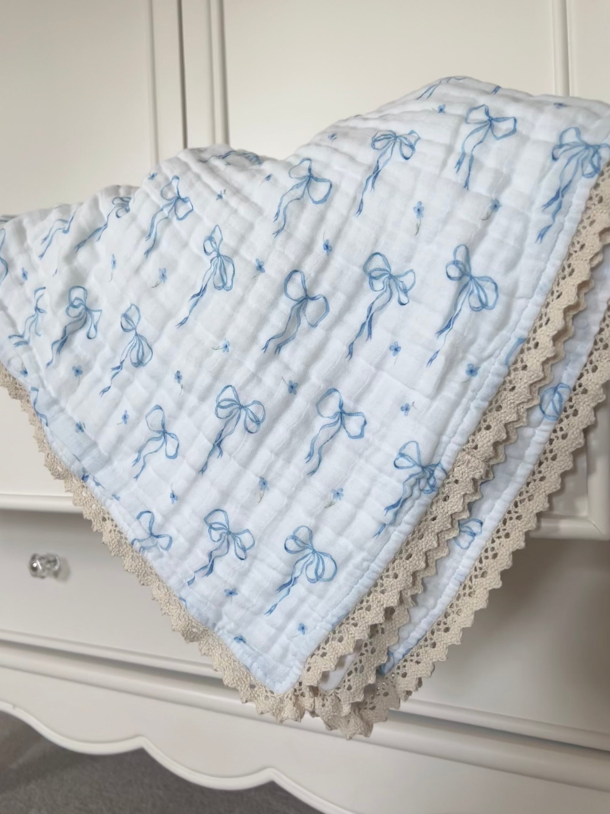 Something Blue 6-Layer Organic Cotton Baby Blanket with Vintage French Lace