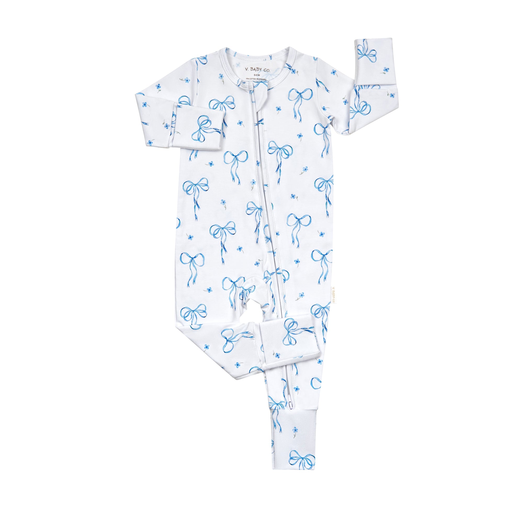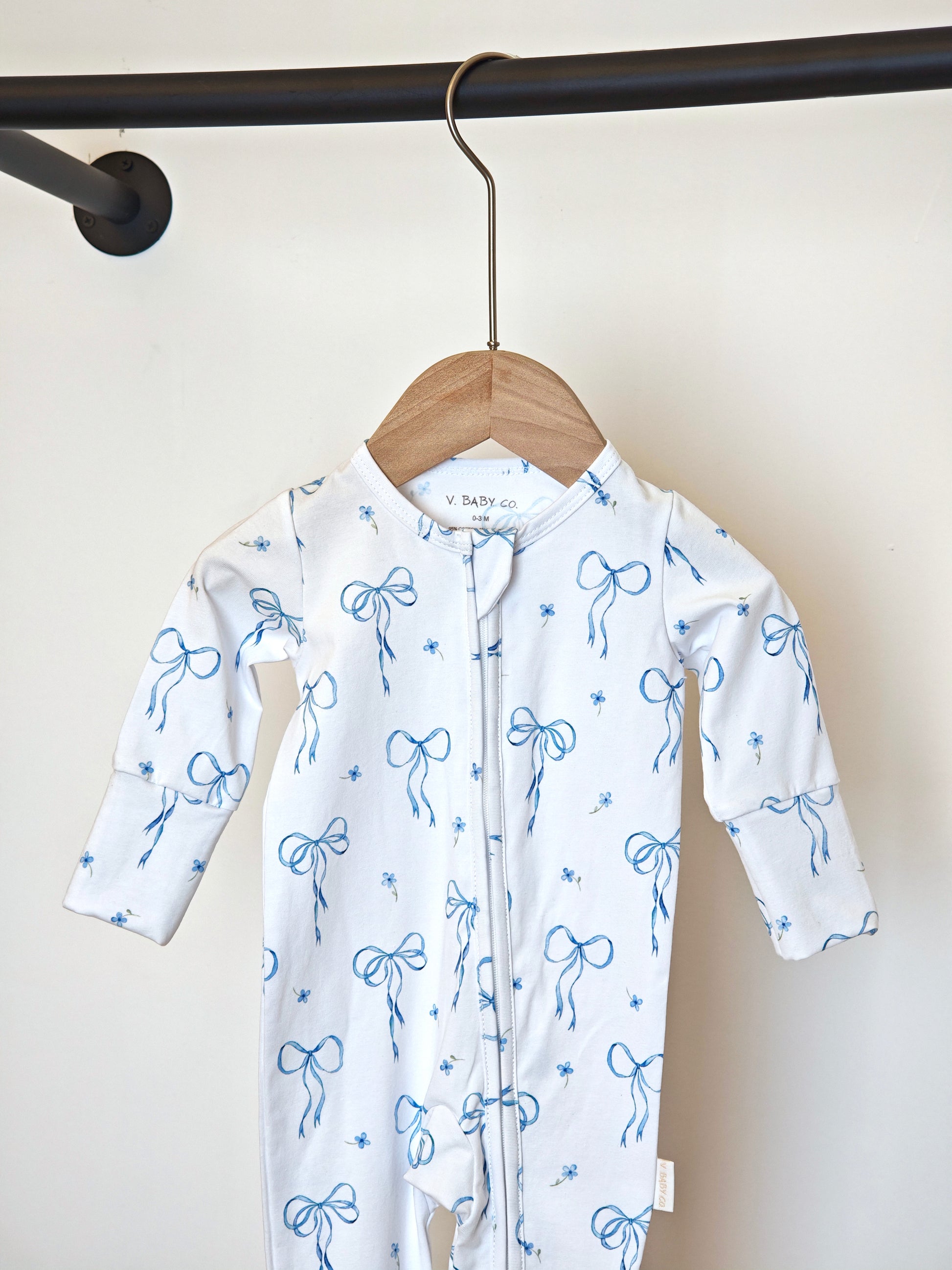 Adorned with a hand-drawn print of delicate blue bows and tiny forget-me-not flowers — symbols of lasting love and precious memories — this special design makes every moment feel a little more magical, from first yawns to first steps.